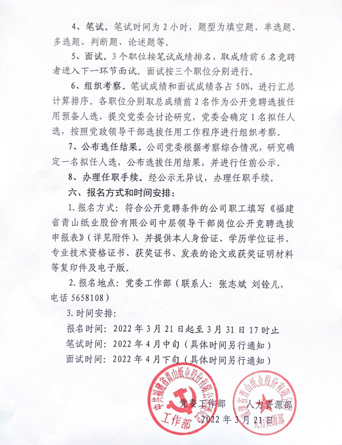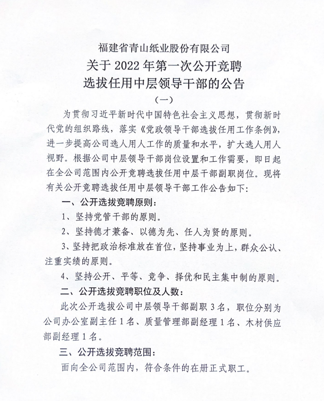 福建省金年會(huì)紙業(yè)股份有限公司 關(guān)于2022年第一次公競(jìng)聘選拔任用中層領(lǐng)導(dǎo)干部的公告(一)